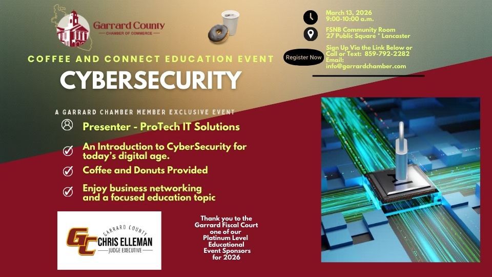 Attention Garrard Chamber of Commerce members! We are thrilled to invite you to our March member-exclusive educational event on CyberSecurity, presented by ProTech IT Solutions. This is a fantastic opportunity to enhance your knowledge and safeguard your business in today’s digital age.